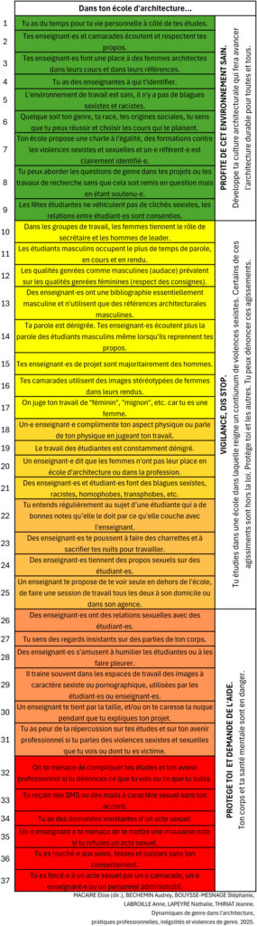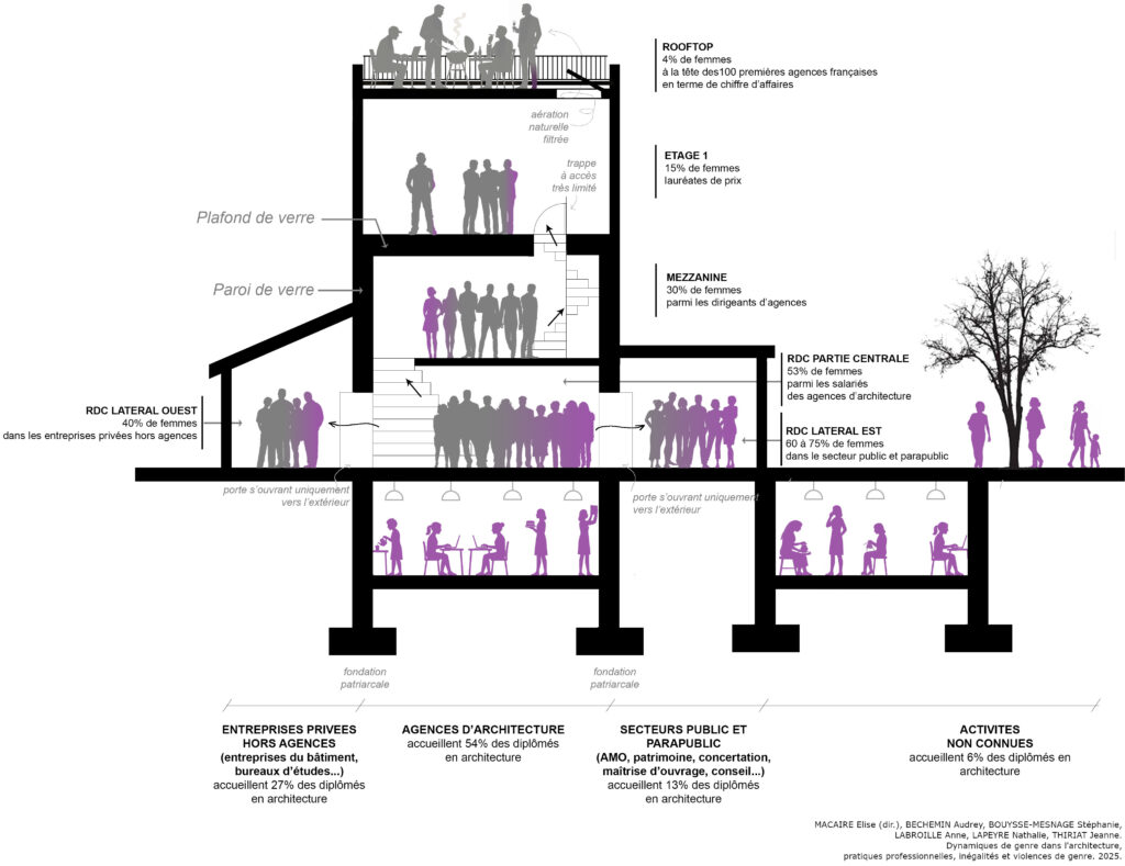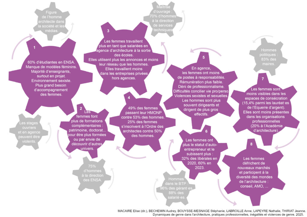 Financée par le ministère de la Culture et conduite par le Laboratoire Espaces Transformations LET-LAVUE de l’ENSA Paris–La Villette, cette recherche dresse l’état des lieux de la féminisation du secteur de l’architecture, met en avant la différenciation sexuée des conditions d’emploi, analyse la distribution genrée des pratiques, des modes d’exercice et des métiers et fait état des résultats d’enquêtes portant sur les violences sexistes et sexuelles. L’étude propose des pistes et préconisations pour la réduction des inégalités de genre dans le secteur de l’architecture.